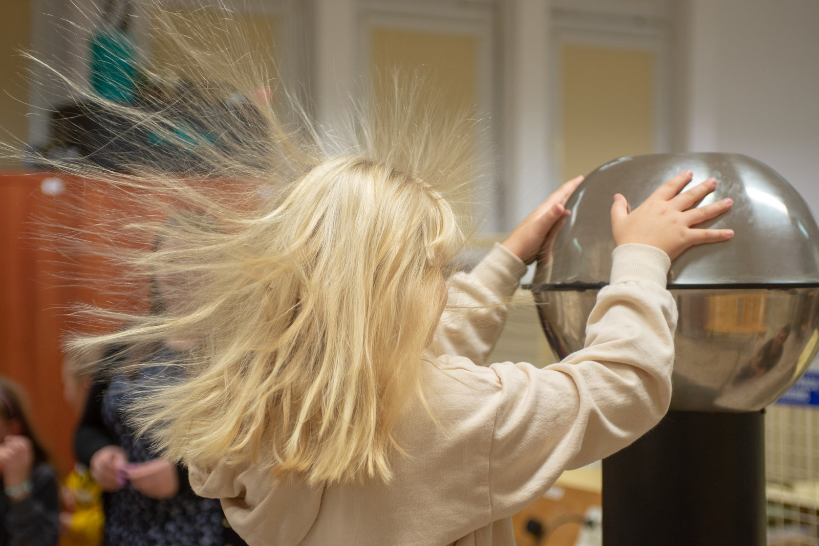 Pan mgr inż. Sebastian Hajder wspomagany przez studentów koła naukowego elektryków "MegaVolt", przedstawił urządzenia i zjawiska badane w laboratorium Techniki Wysokich Napięć. Uczniowie z zainteresowaniem słuchali jak działa generator Marx'a, generator Van der Graaf'a oraz cewka Tesli. Pojawiły się również trudne pytania, z którymi musieli zmierzyć się studenci z "MegaVolt".