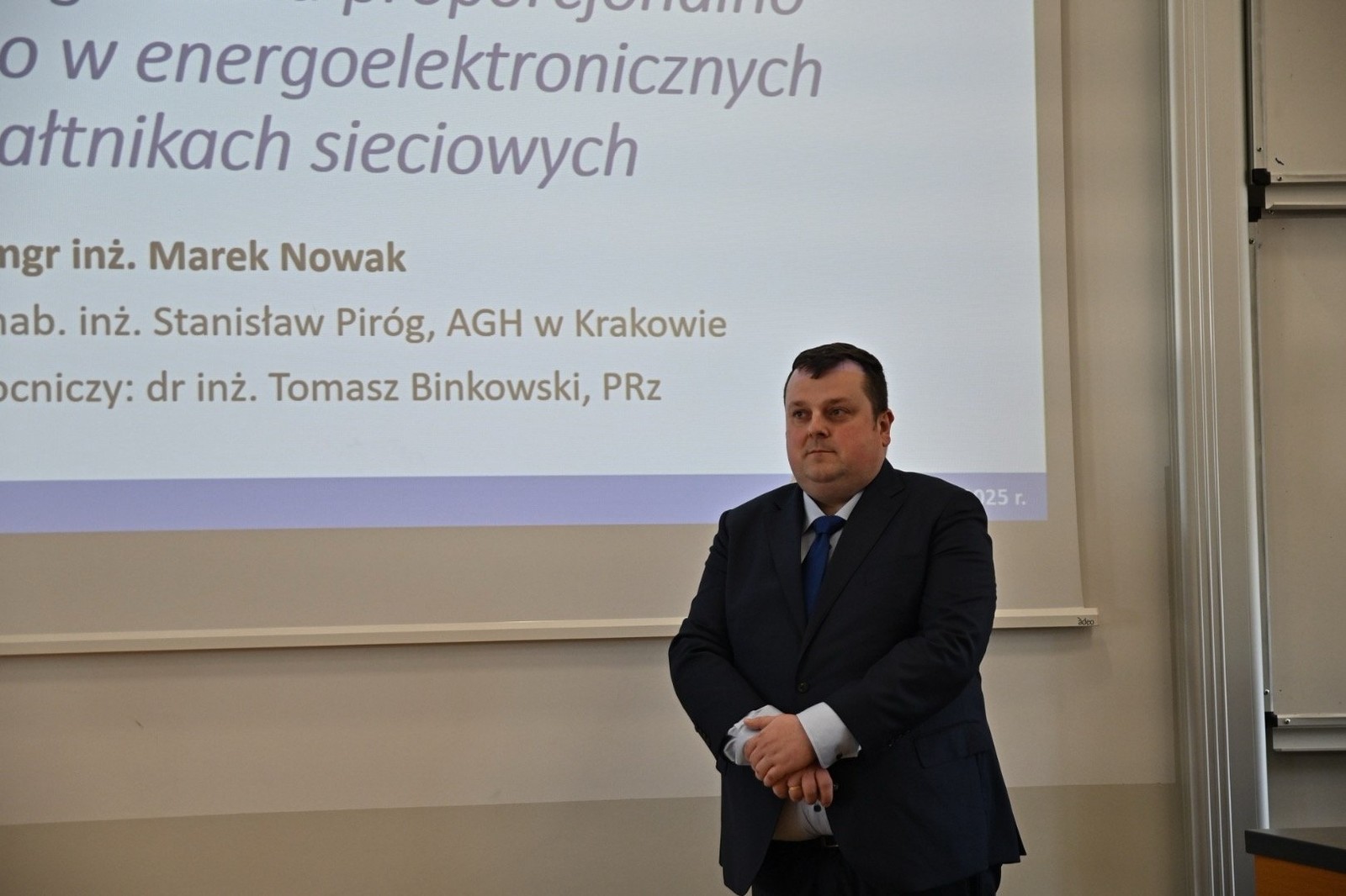 W dniu 8 maja 2025 roku na Wydziale Elektrotechniki i Informatyki odbyła się publiczna obrona pracy doktorskiej mgr. inż. Marka Nowaka na temat: „Zastosowanie regulatora proporcjonalno-rezonansowego w energoelektronicznych przekształtnikach sieciowych”. Pan mgr Marek Nowak jest pracownikiem Katedry Energoelektroniki i Elektroenergetyki. Promotorem rozprawy doktorskiej był prof. dr hab. inż. Stanisław Piróg, z Akademii Górniczo-Hutniczej w Krakowie. Recenzentami rozprawy byli: