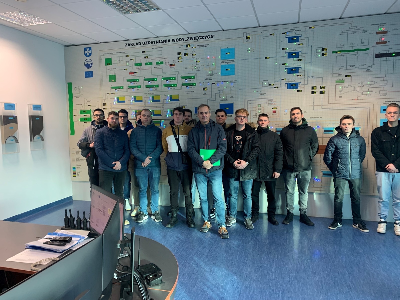W dniu 1 grudnia 2023 roku odbył się wykład z modułu „Logiczne sterowanie procesami energetycznymi” zawierający elementy praktyczne, koordynowany przez dra inż. Tomasza Binkowskiego. Wykład odbył się na terenie Zakładu Uzdatniania Wody w Rzeszowie, gdzie kierownik Zakładu Produkcji Wody, Pan Kazimierz Przerwanek, omówił i zaprezentował funkcjonujące systemy sterowania procesem uzdatniania i produkcji wody dla miasta Rzeszów. W trakcie spotkania studenci zapoznali się z zagadnieniami produkcji dla potrzeb własnych i dystrybucji energii elektrycznej. Szczególne zainteresowanie wzbudził system pomiaru kąta rozwarcia muszli w małżach monitorujących poziom zanieczyszczenia wody. Wykład wzbudził ogromne zainteresowanie w związku z wyjątkowo ciekawym sposobem przedstawiania zagadnień praktycznych w funkcjonującym systemie produkcyjnym.